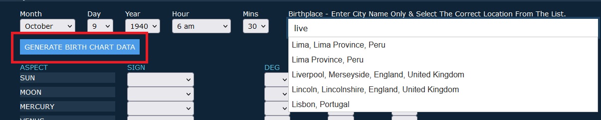1) Enter All your Birth details, Birthplace and Click GENERATE BIRTH CHART DATA: